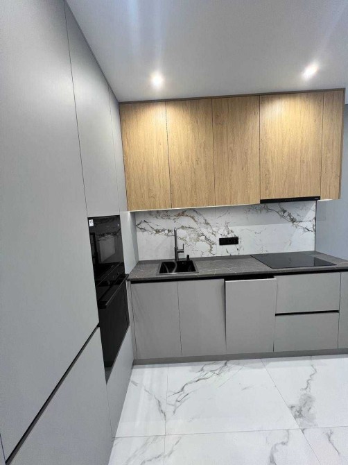 Інтер’єр виконаний у сучасному стилі — поєднання мінімалізму, дерева та мармуру створює відчуття затишку і простору.