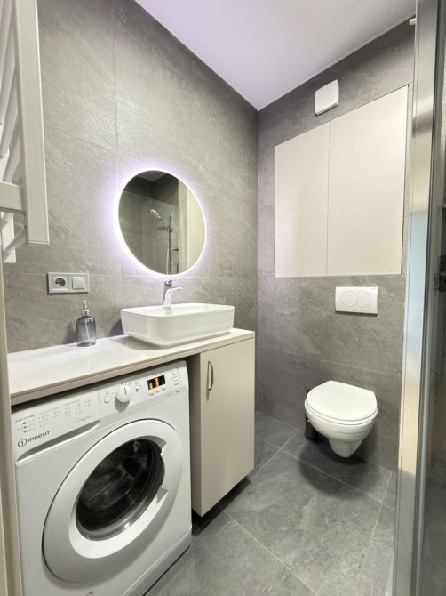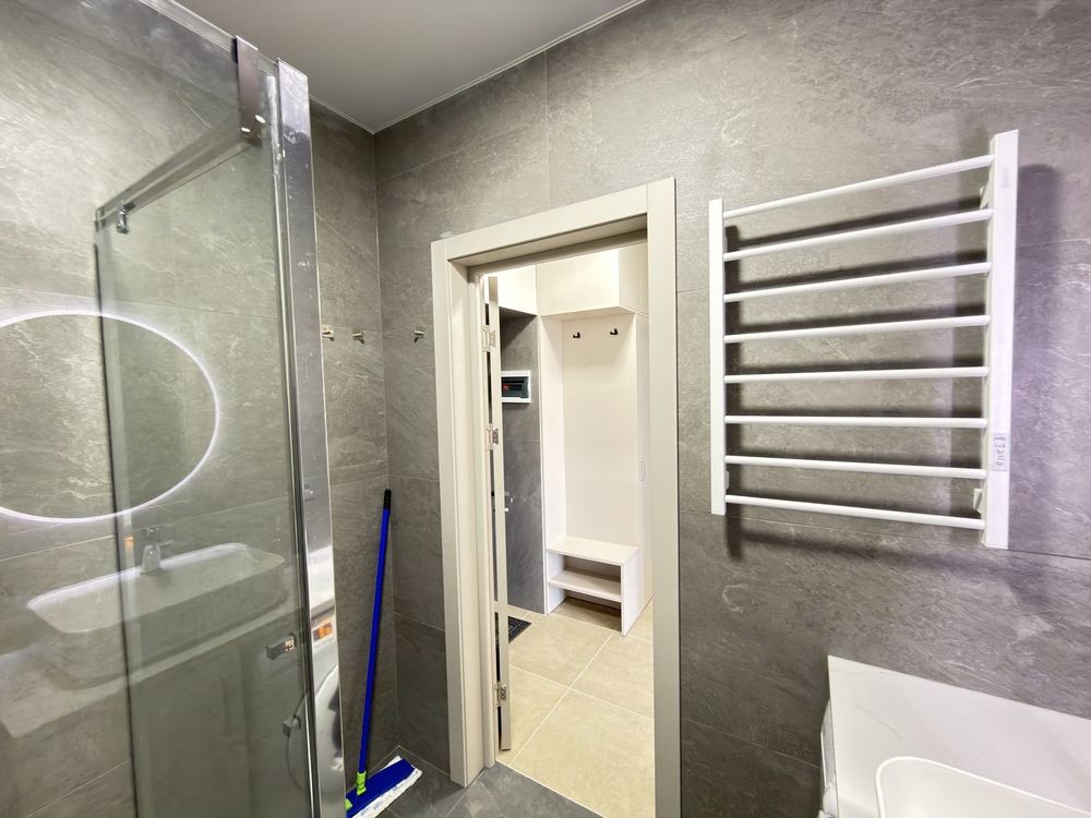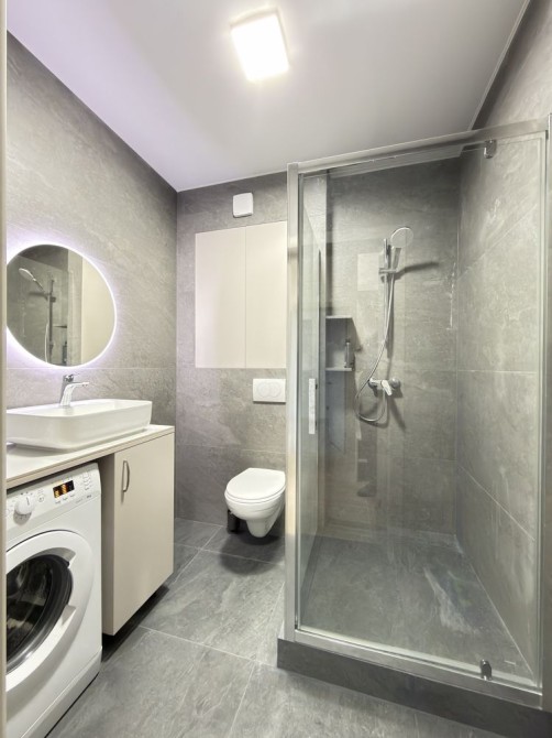 Сумісний санвузел: душова кабіна, умивальник, дзеркало, пральна машина.