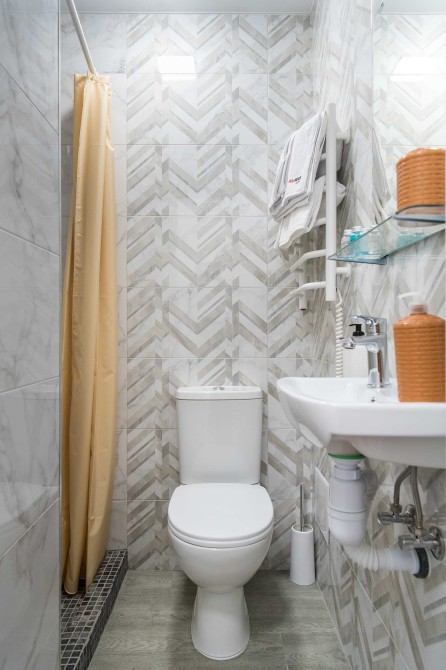 Ванна кімната: Сучасна душова кабіна, пральна машина, фен та праска. Свіжі м'які рушники вже чекають на вас.