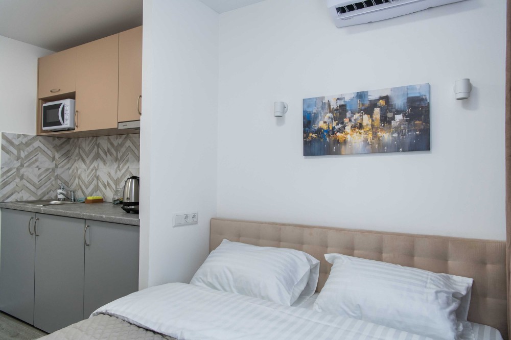 Сон та клімат: Зручний двоспальний диван з білосніжною білизною, кондиціонер та Smart-TV. Одноразові капці вже включені у вартість.