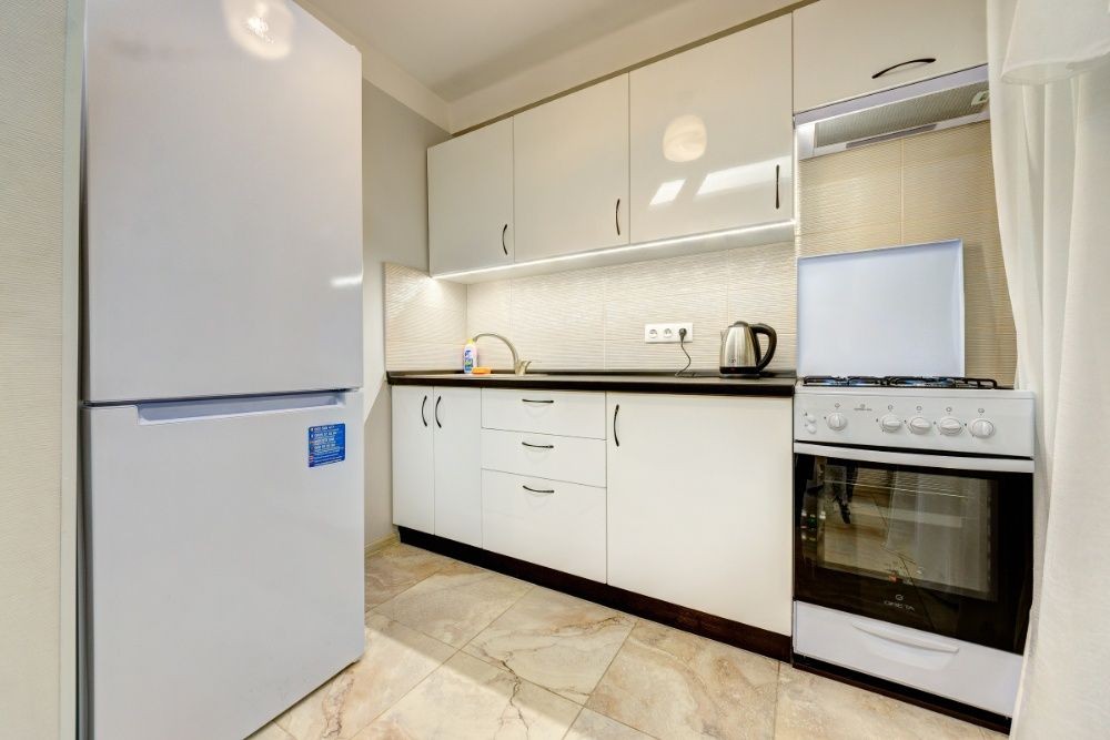 Кухня – компактная и очень светлая. В наличии вся необходимая техника и посуда: холодильник, плита, электрочайник. Из окна открывается роскошный пейзаж на Киев.