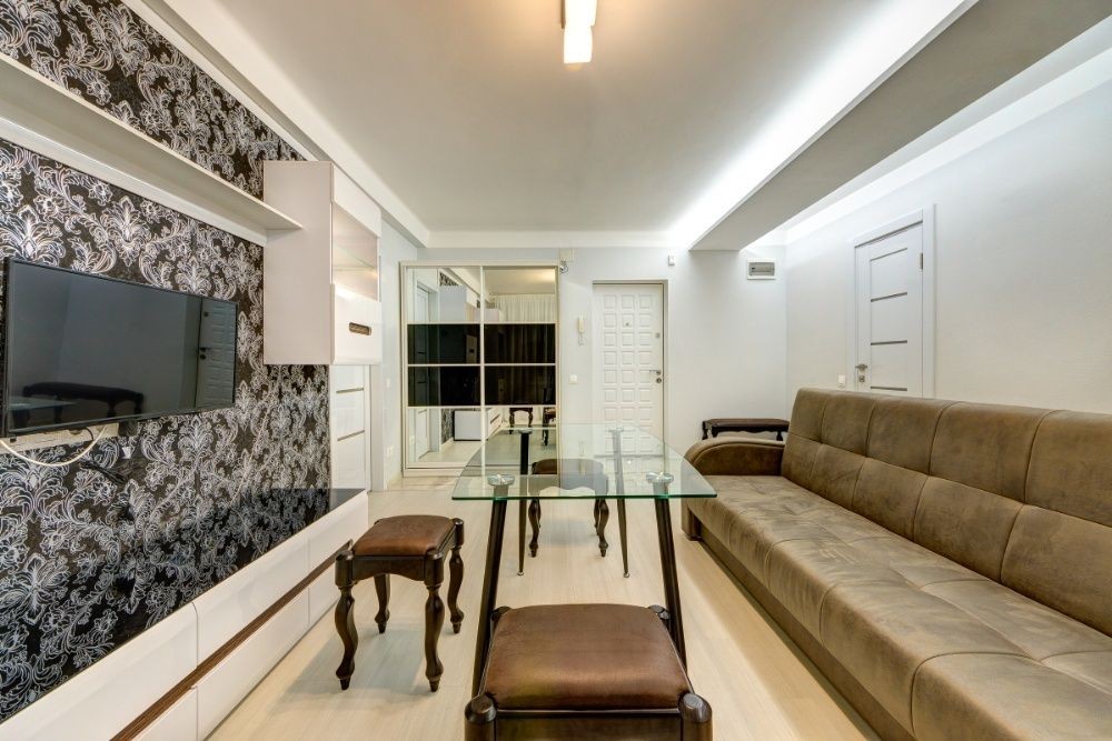 В зале-студии размещен шикарный двухместный диван, который станет удобным спальным местом. Напротив есть ТВ-зона, а также большой стеклянный стол и дизайнерские стулья из резного дерева для обеденной зоны. Идеальная локация для дружеских посиделок. Также имеется встроенный шкаф-купе для одежды и вещей.