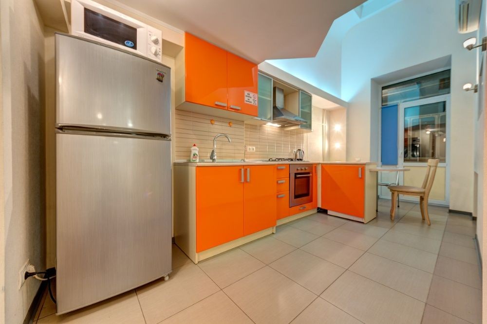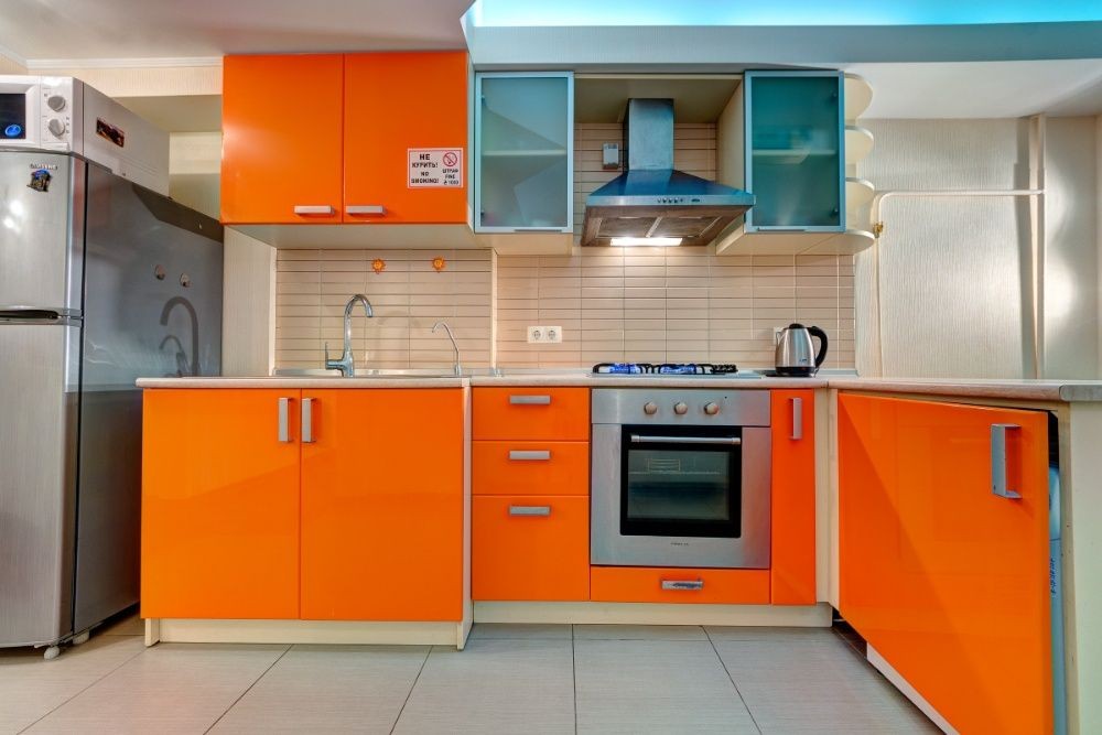 На просторной кухне с ярко-оранжевой мебелью есть холодильник, микроволновая печь, газовая плита с духовым шкафом, стиральная машинка и электрический чайник. Имеется выход на балкон.