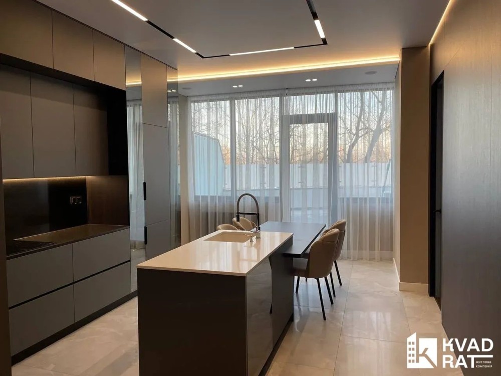 Якісна кухня з гранітною стільницею, техніка скритого монтажу, кухонний «острів» з обідньою зоною