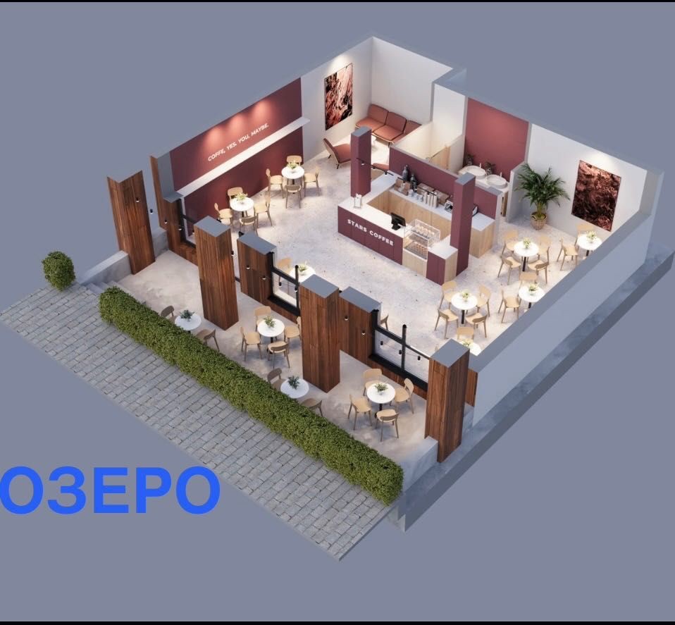 Ідеальне приміщення під кафе з виглядом на озеро та ліс з великою терасою (в плані зменьшені квадрати пропорційно по факту вона 9 м * 2, 5 м