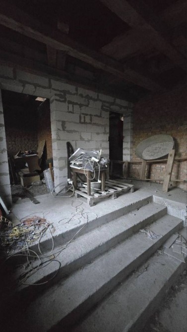 Выстроен из красного кирпича, установлены крыша , окна. По планировке 3 раздельные комнаты, кухня, санузел. Есть возможность обустроить мансардный этаж.