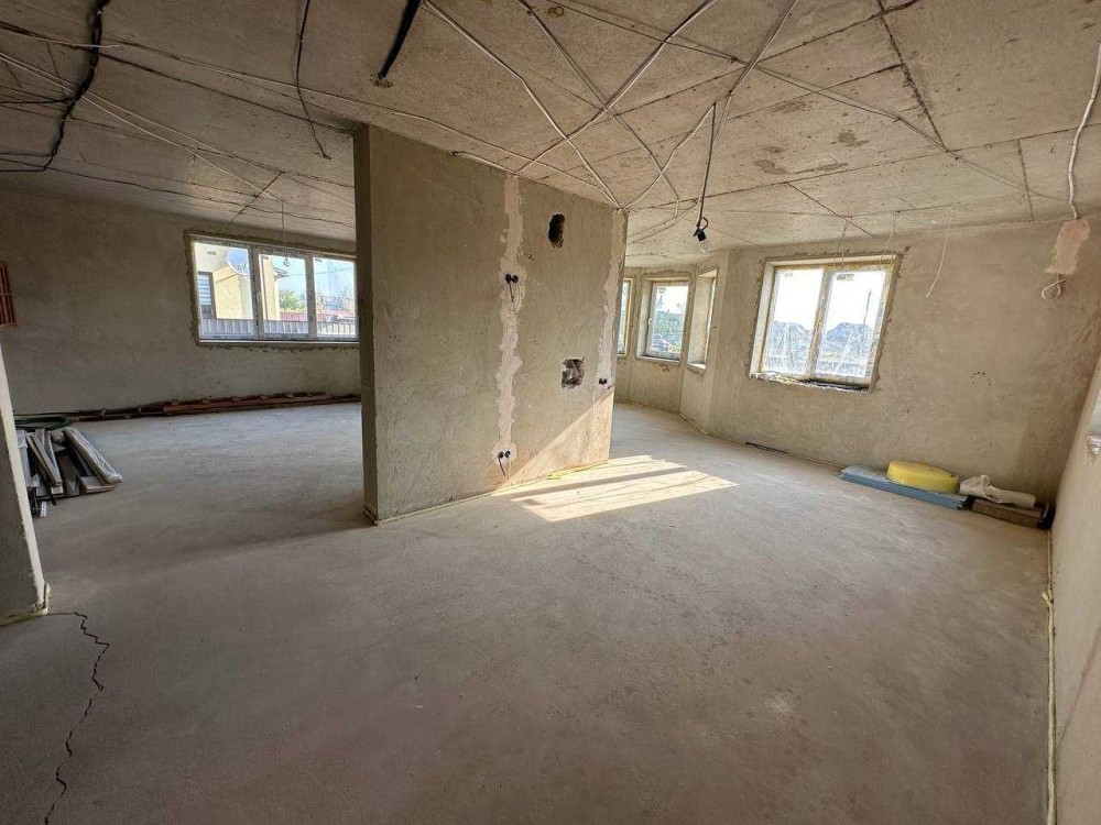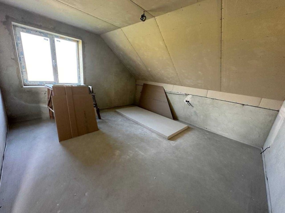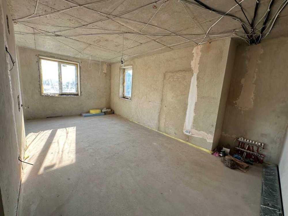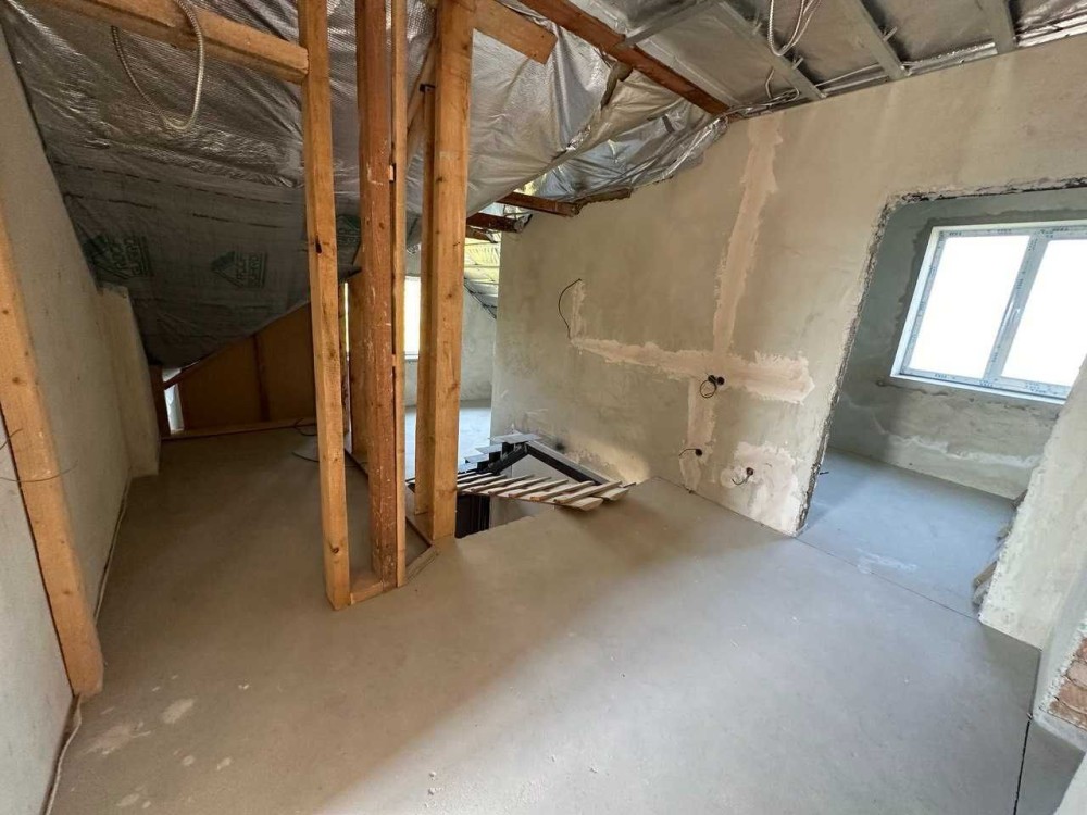 - В будинку виконані всі чорнові ремонтні роботи: внутрішня штукатурка стін, підігрів підлоги на першому поверсі, чистова стяжка по всьому будинку, розводка електрики води та каналізації, облаштована паливна кімната, утеплення даху мінватою, частково покручений гіпсокартон.