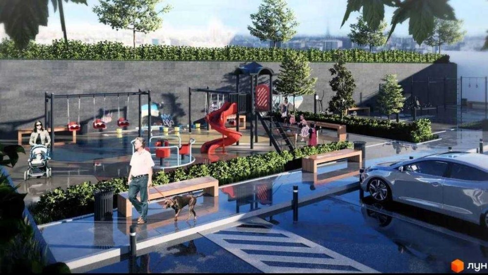 Є закритий дворик з дитячим майданчиком, зоною відпочинку для дорослих та цілодобовим відеонаглядом.