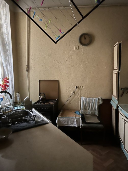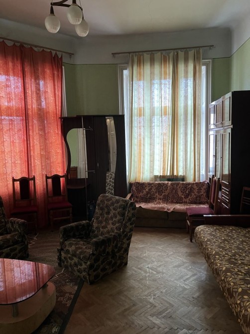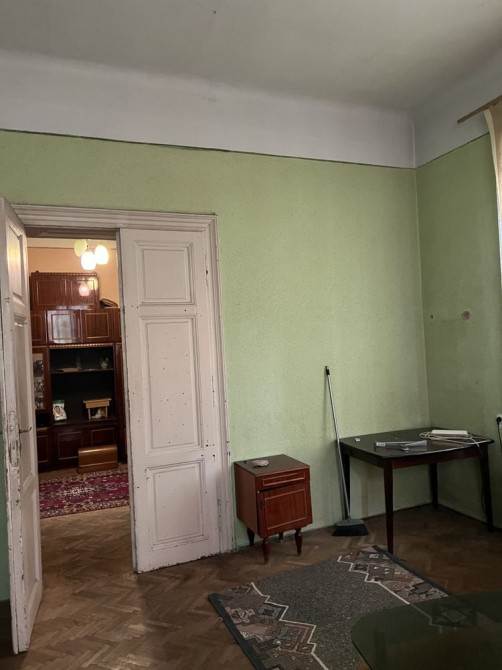 знаходиться в австрійському будинку в історичному центрі міста по вул.Кайндля(Челюскінців),житловий стан,пічне опалення,високі стелі,прохідні кімнати,а коридор і ванна спільного користування з сусідньою квартирою.