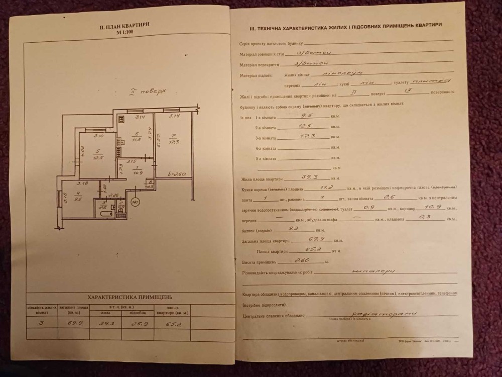 Три роздільні кімнати: 9.5; 12.5; 17.3. Велика кухня-11.2м2. Два коридори: 2.26; 10.9.