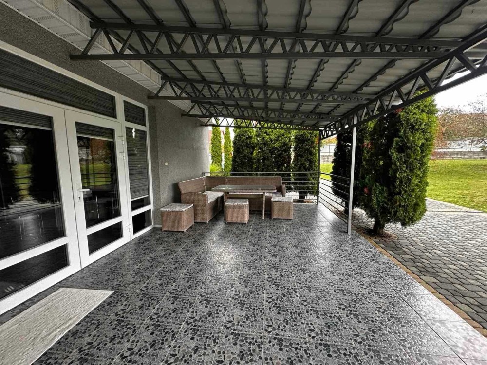 Є тераса, сад з декоративними деревами. Під'їзд асфальтований. Територія огороджена.
