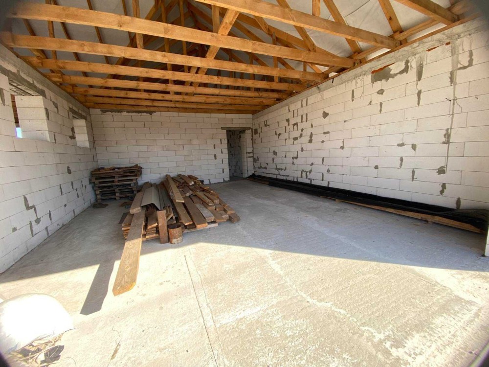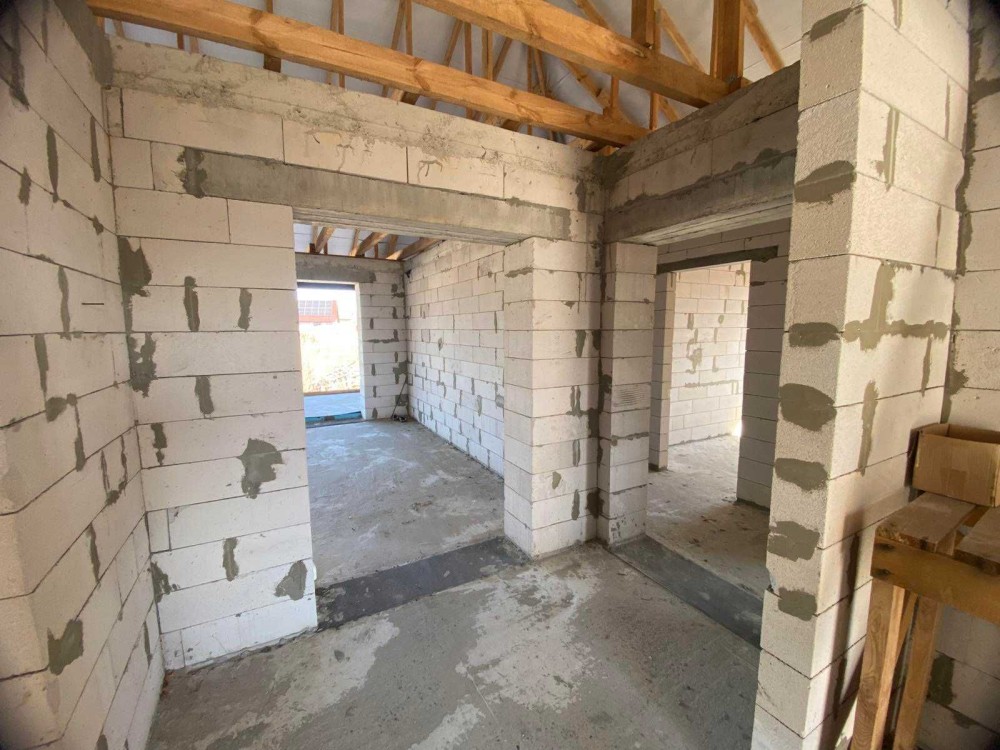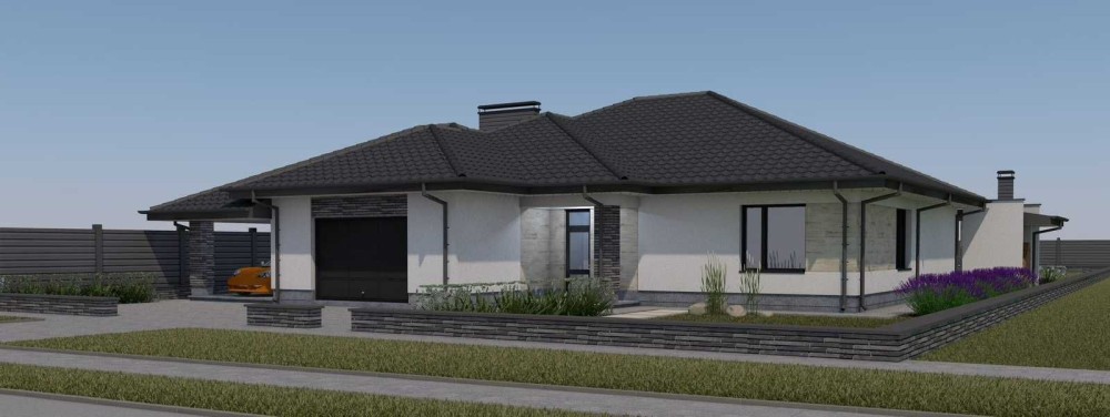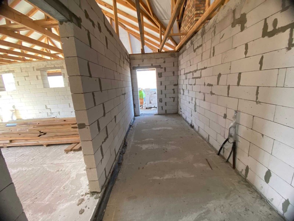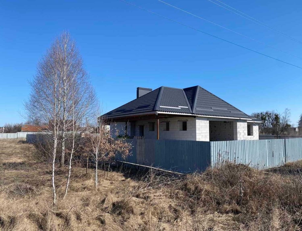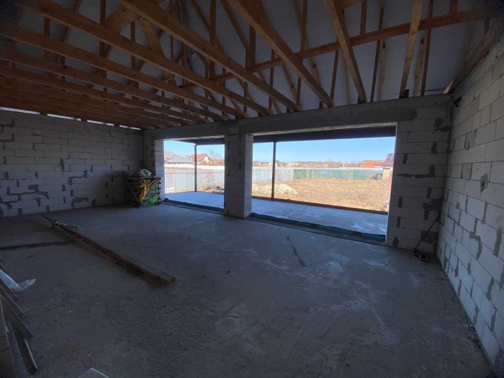 Будинок має велику кухню-студію (45кв.м) з виходом на велику терасу, 3 кімнати, гардеробну, ванну, котельню, вбудований гараж на два авто та навіс для автомобілів.