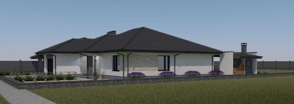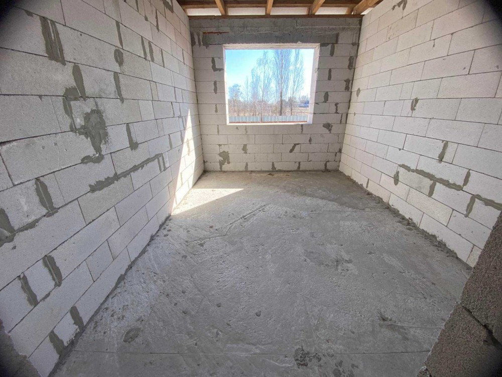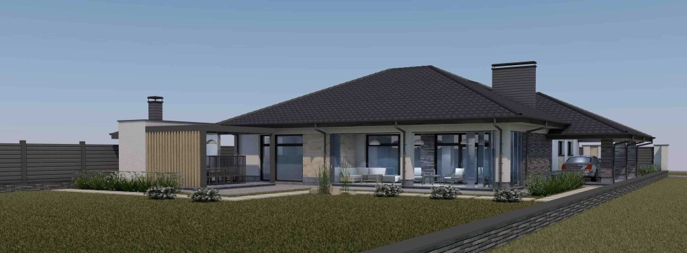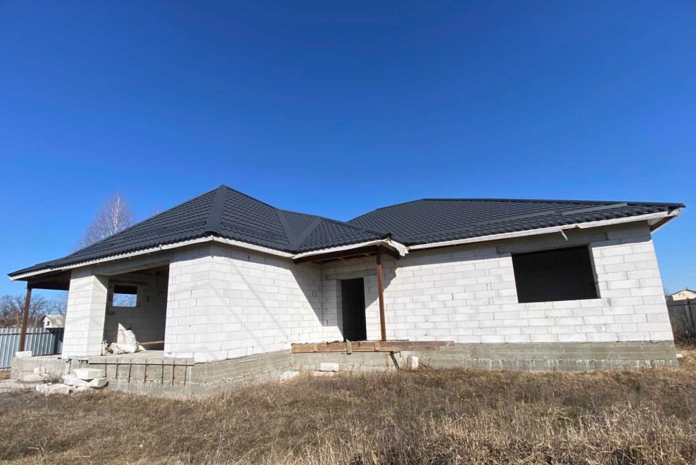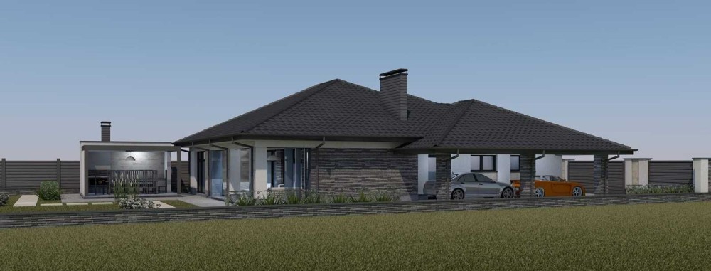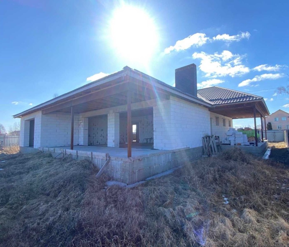 Будинок має велику кухню-студію (45кв.м) з виходом на велику терасу, 3 кімнати, гардеробну, ванну, котельню, вбудований гараж на два авто та навіс для автомобілів.