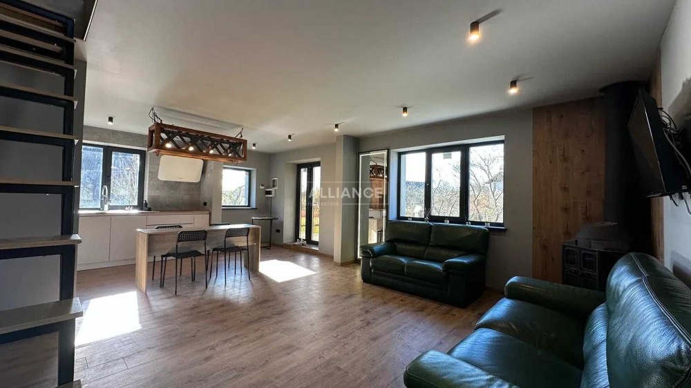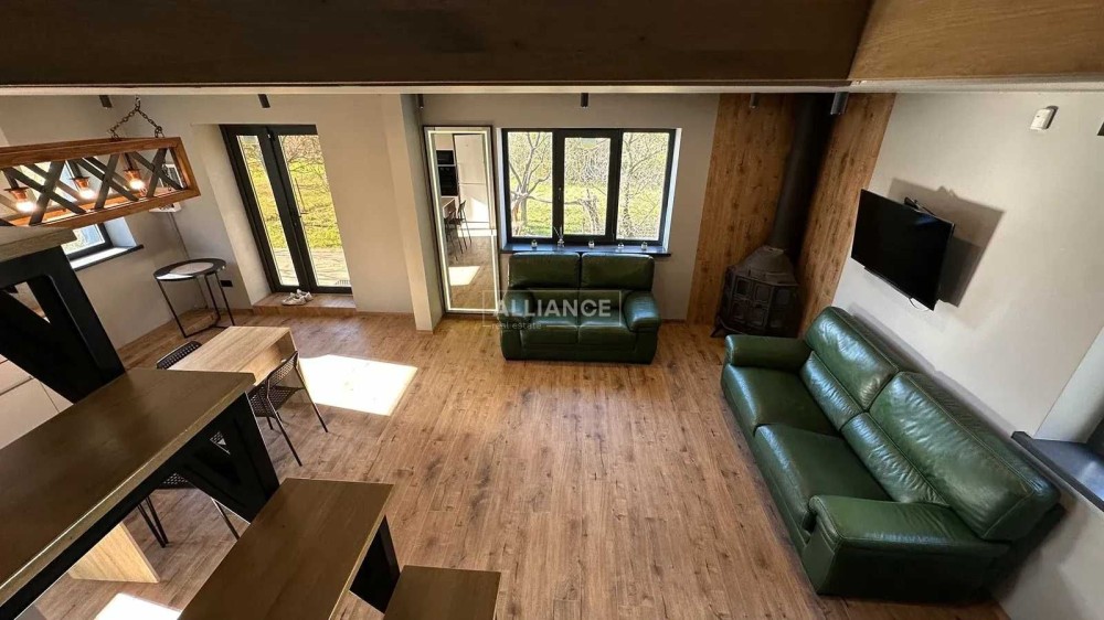 -1 поверх 35м. кухня вітальна, 2 шкіряних дивани (1 розкладний), телевізор 45 дюймів, твердопаливний камін з рукавом на другий поверх, кондиціонер до -20, посудомийна машина, індукційна плита, духова шафа, мікрохвильова піч, витяжка, холодильник, також встановимо нову кухню.