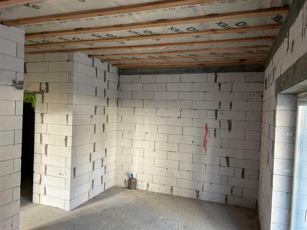 Побудований з газоблоку (300мм), утепленний пінопластом (100мм) +декоративна штукатурка, кровля- металочерепиця з утепленням "базальтової" вати. (200мм),перекриття дерево утеплене ватою (150мм), вікна- 6ти камерний профіль "WDS" (70мм) +2камерний енергозберігаючий стеклопакет (40мм), забор з профнастилу та двір викладений бруківкою.