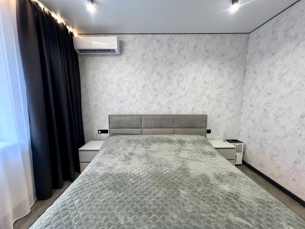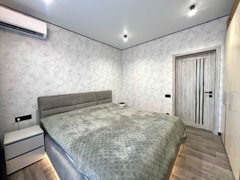 Спальня максимально світла, окрім основного освітлення є багато продуманої підсвітки ( ліжко, карнизи, точкові лампи), кондиціонер. Зручне, виконане на замовлення ліжко.