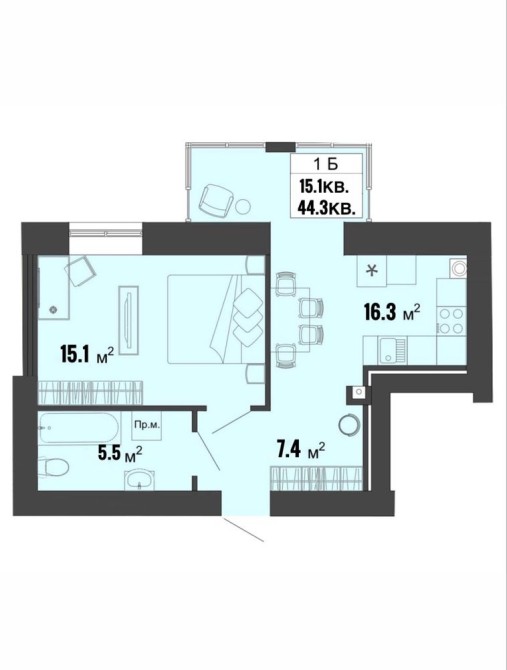 • Общая площадь 44.3 м2