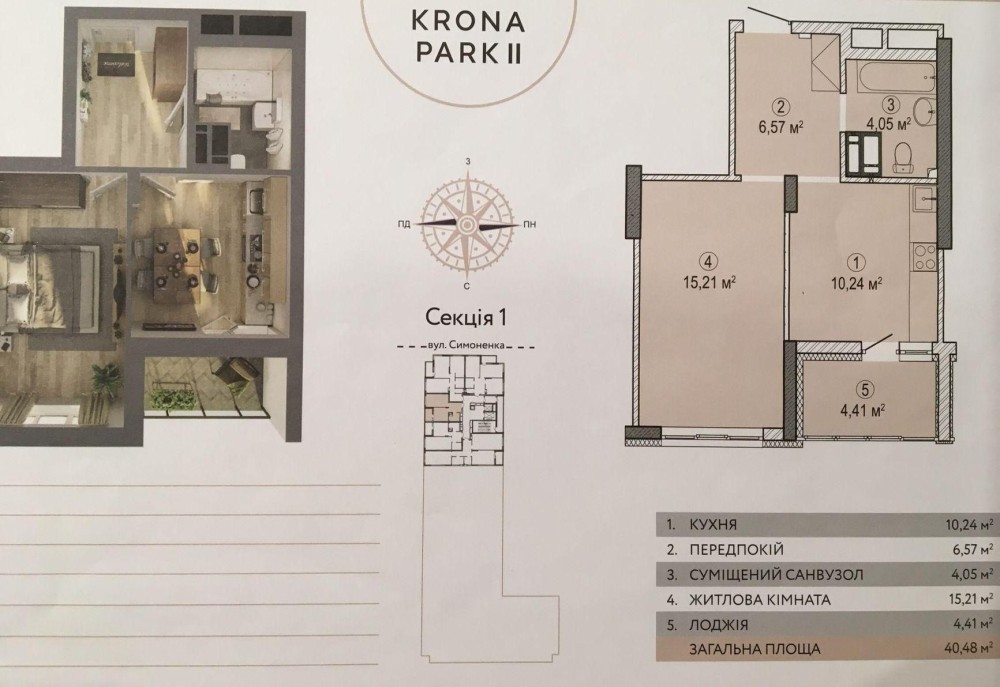Загальна площа - 40,5 кв.м., кухня 10.3 кв.м, кімната, передпокій, санвузол, лоджія.