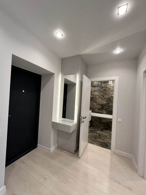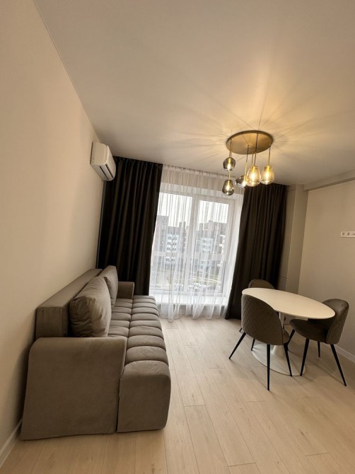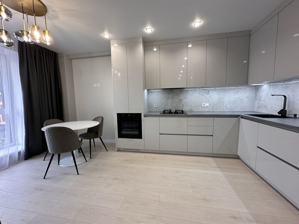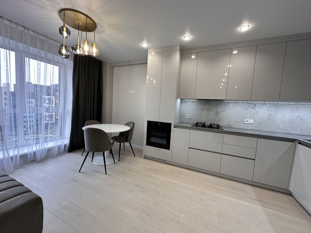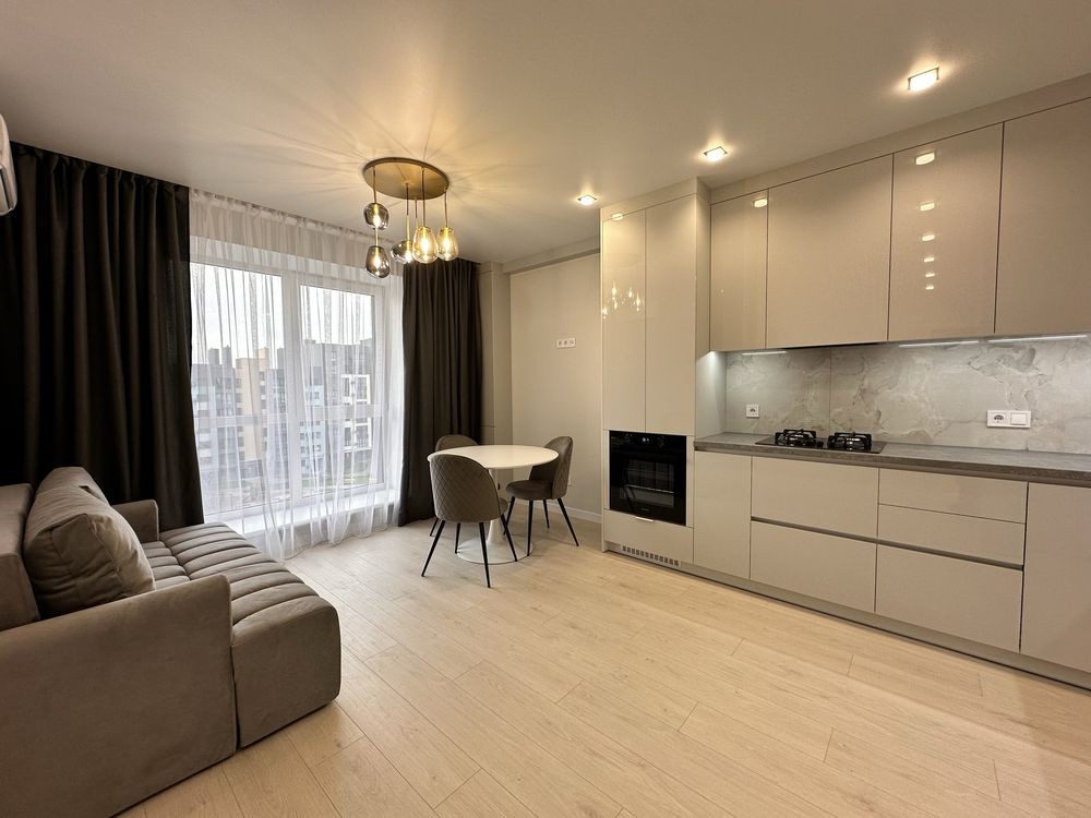 Простора кухня-вітальня, укомплектована меблями та технікою, кондиціонер, пральна машина, тепла підлога в санвузлі