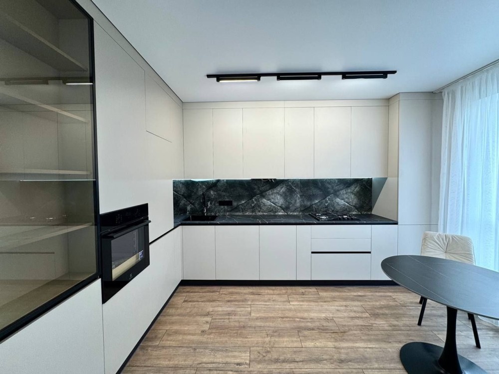 кухня-вітальня з вбудованими меблями та технікою,