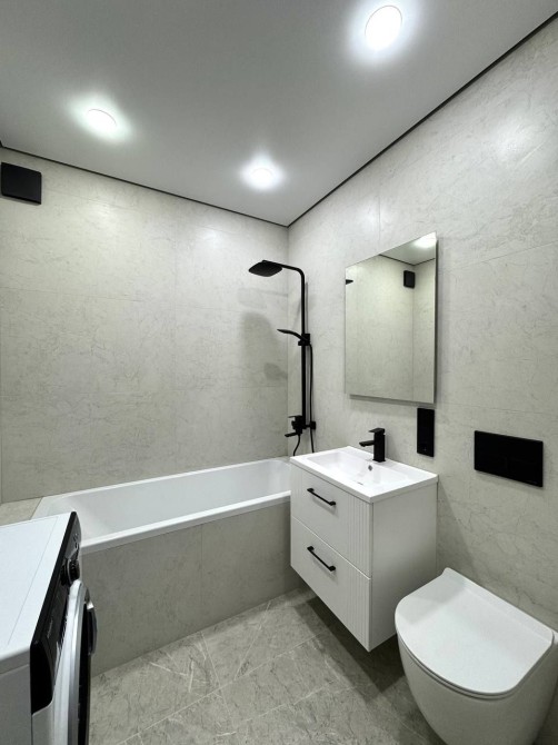 просторий санвузол з ванною, сучасною сантехнікою та пральною машиною,