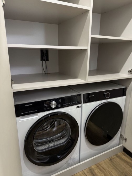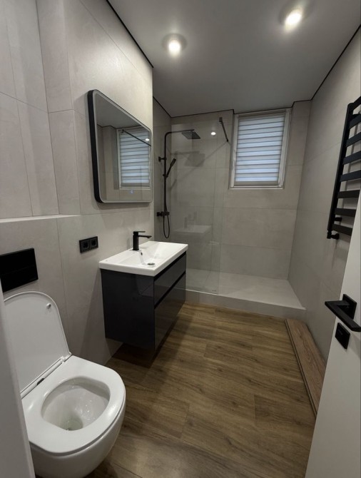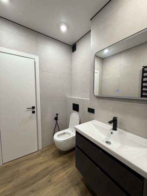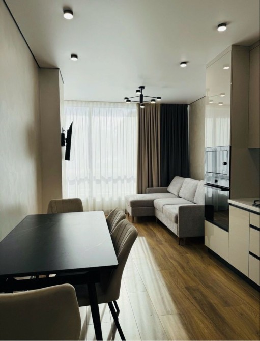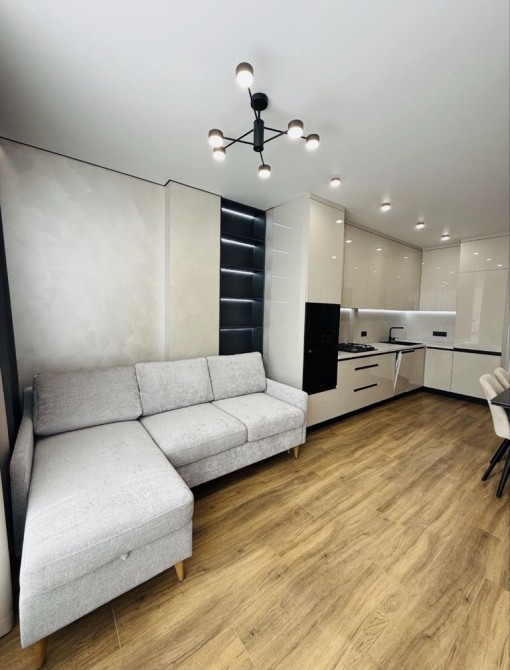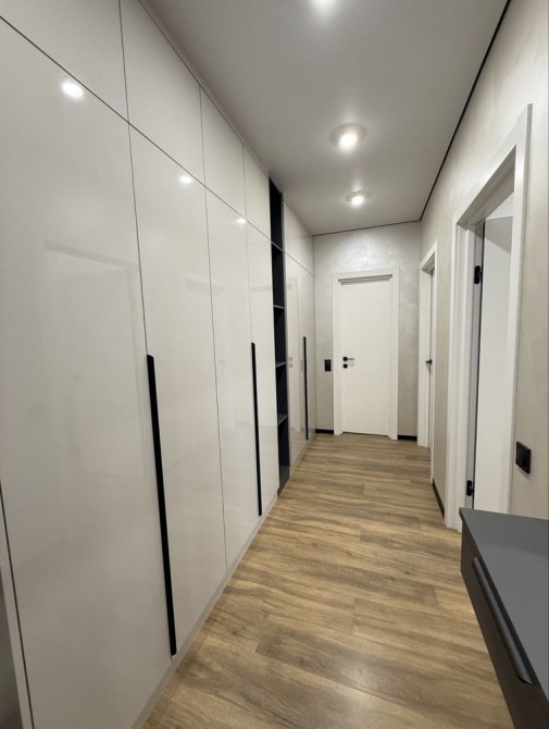 Велика кухня-студія, спальня з відпочинковою зоною та коридор з великими вмонтованими шафами. Квартира стильна, сучасна та якісно зроблена.