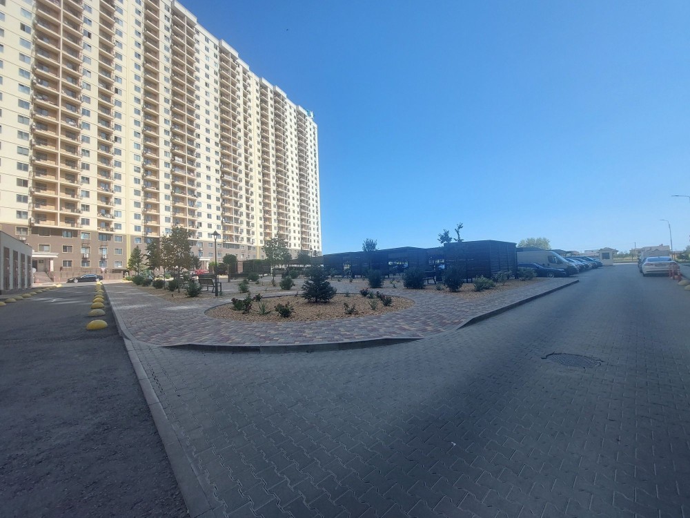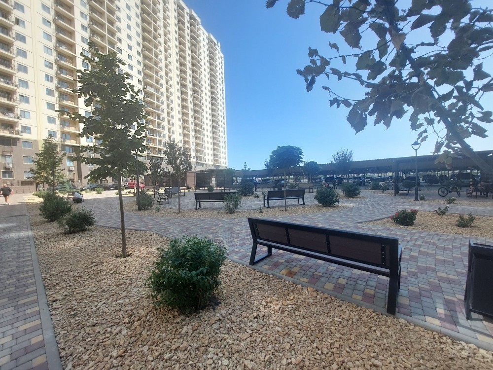 Закрытая охраняемая территория комплекса, много зелёных насаждений, детские и спортивные площадки, наземный паркинг.