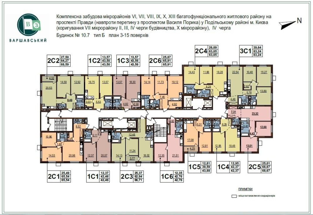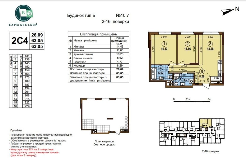 Площа 63/26/18м2. План 2С3. Поверх 10/16(21).