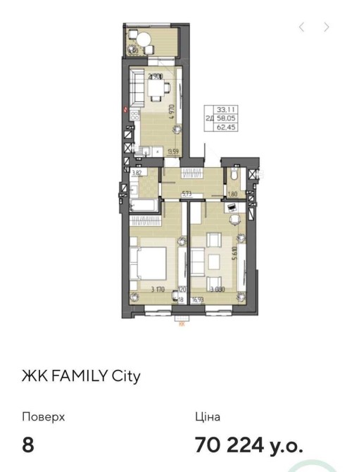 Площа 62,9 м2 , житлова 58м2 ( кухня 14м2, вітальня 17м2, спальня 16м2,санвузол 2м2, ванна 4м2,балкон 4м2 )