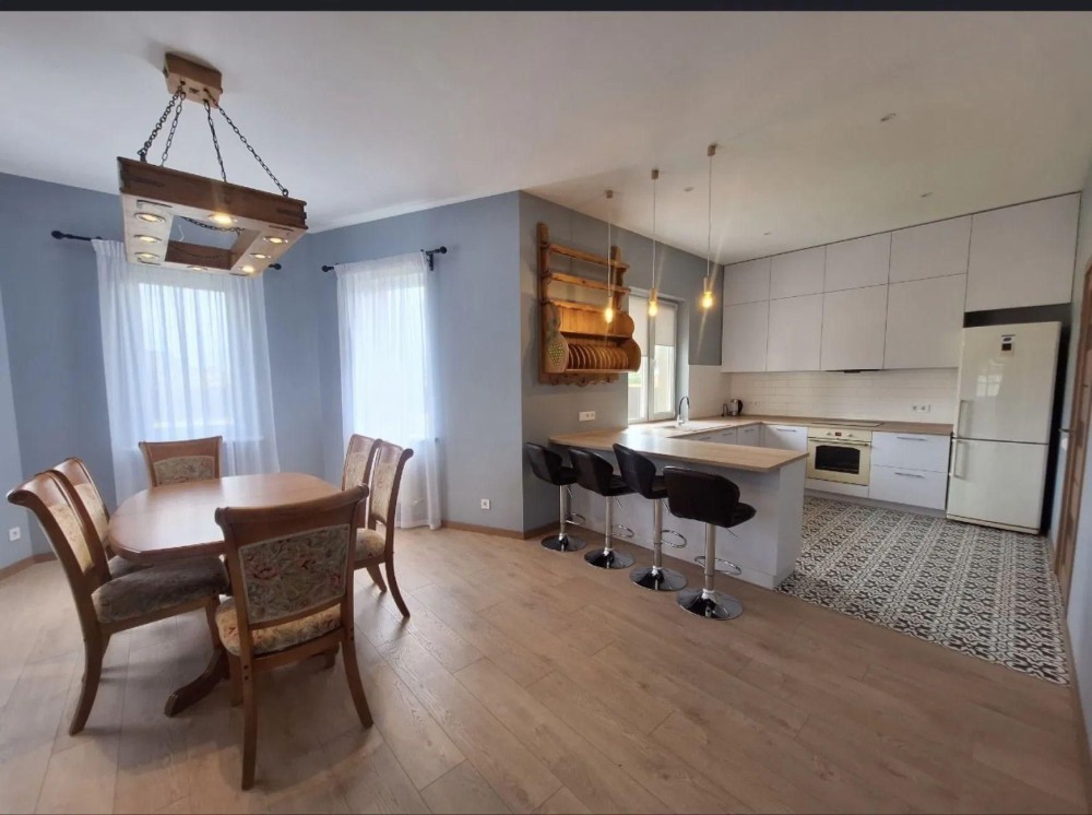Також обладнений необхідною технікою : холодильником, варильною панеллю, духовою шафою, посудомийною машиною, пральною машиною, мікрохвильовкою