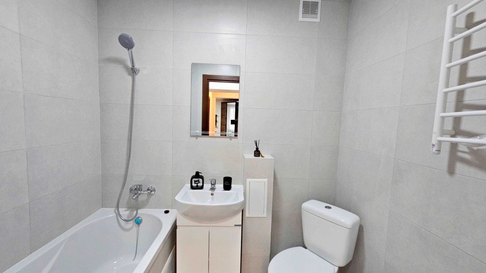 встроенная кухня, новая сантехника, двуспальная кровать, удобный диван, вместительный угловой шкаф — всё остаётся новым владельцам.