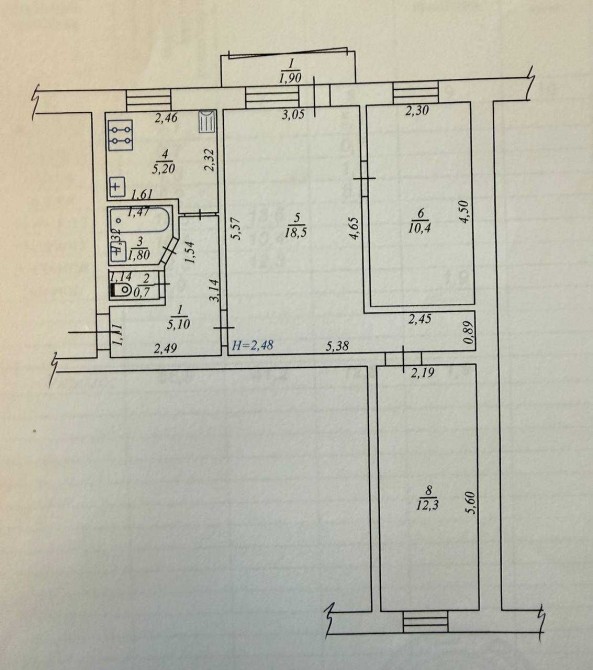 • Площадь кухни 5.2 м2