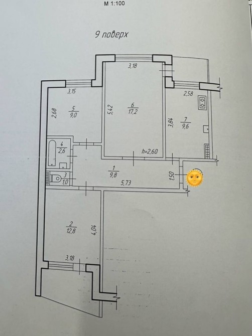 -Загальна площа 66 м2. Велика кухня 9,6м2 , три ізольовані кімнати : 17,2, 12,8 , 9 м2 , роздільний санвузол , 2 просторі лоджії , одна засклена металопластиком .