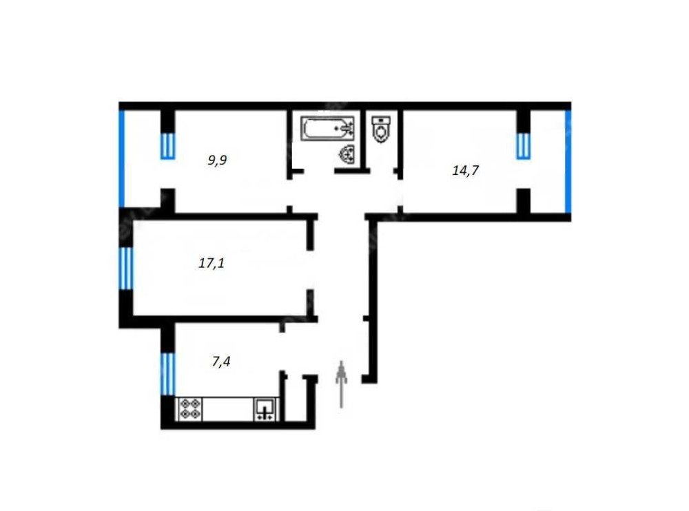 Квартира загальною площею 70 м2. Три окремі кімнати : 9,9 + 17,1 + 14,7 м2. Кухня 7,4 м2, санвузол роздільний, з ванною. Є два балкони. Стан квартири житловий, з необхідною технікою і меблями, але ремонт потрібний. Утеплений фасад.