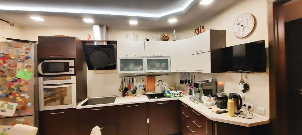 Общая площадь 121 м. квадратный, площадь кухни 10 м. квадратных с выходом в гостиную ( установлена дверь в проёме). Комнаты все раздельные, просторные, также раздельный санузел, есть гардеробная, застеклённый балкон.