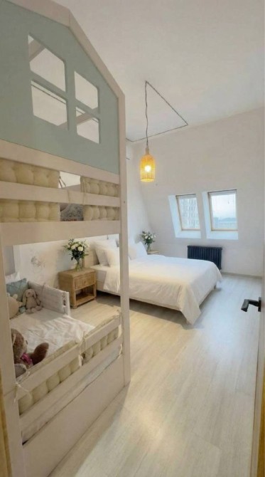 На першому рівні розташовані дві спальні. Основна спальня обладнана великою нестандартною двоспальною ліжком, двома ротанговими тумбами ручної роботи та дитячим дворівневим ліжком з гіркою. Усі меблі виготовлені українськими майстрами з натурального дерева. Друга спальня також має велике дерев’яне ліжко та дві приліжкові тумби з масиву.