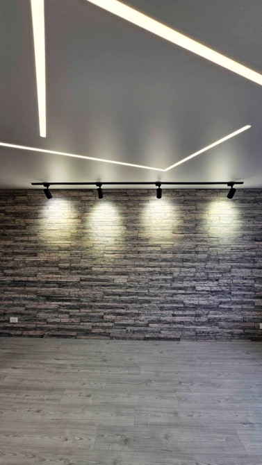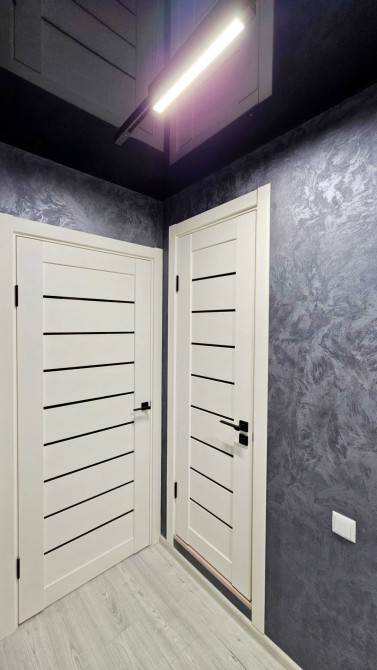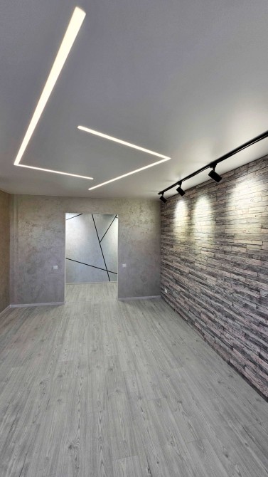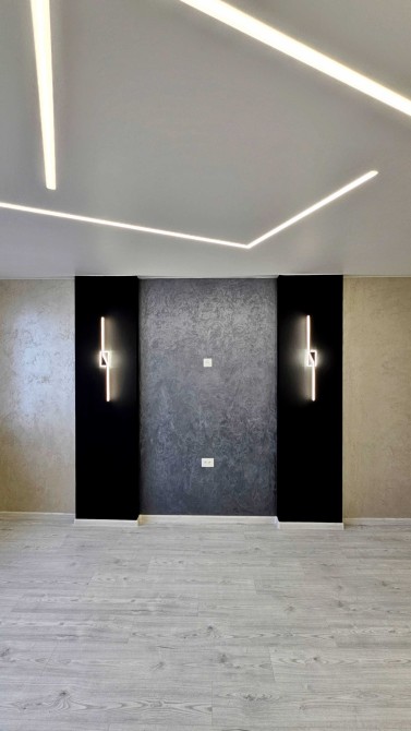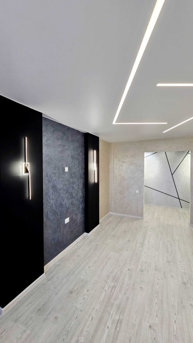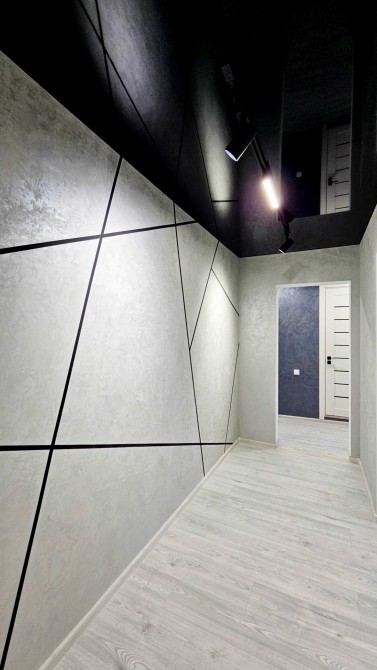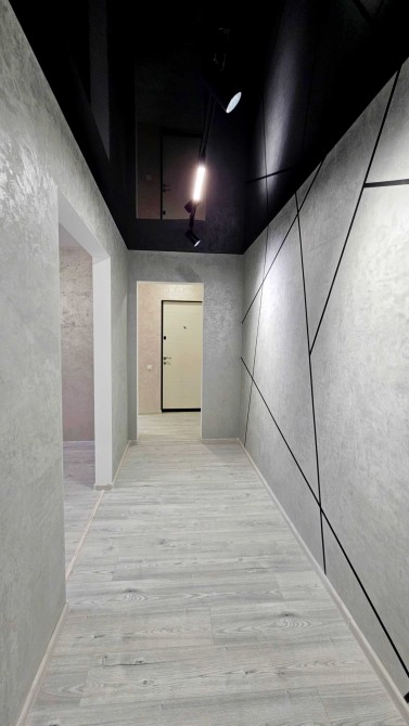 По всей квартире уложен ламинат, установлены подвесные потолки со стильной подсветкой, стены оформлены декоративной штукатуркой, что создаёт современный интерьер.