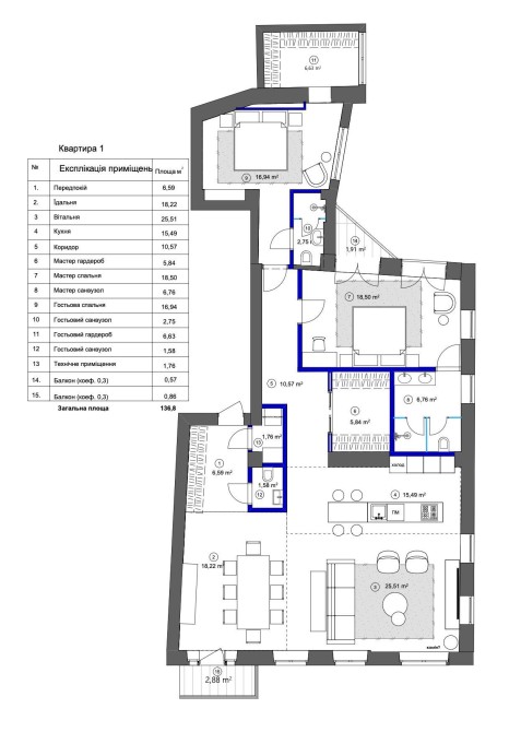 Планування: велика кухня-вітальня з виходом на фасадний балкон, 2 окремі спальні кімнати, 3 санвузли, 2 гардеробні, хол. 2 балкона, з одного — краєвид на бульварну частину вул. Антоновича та парк Шевченка.