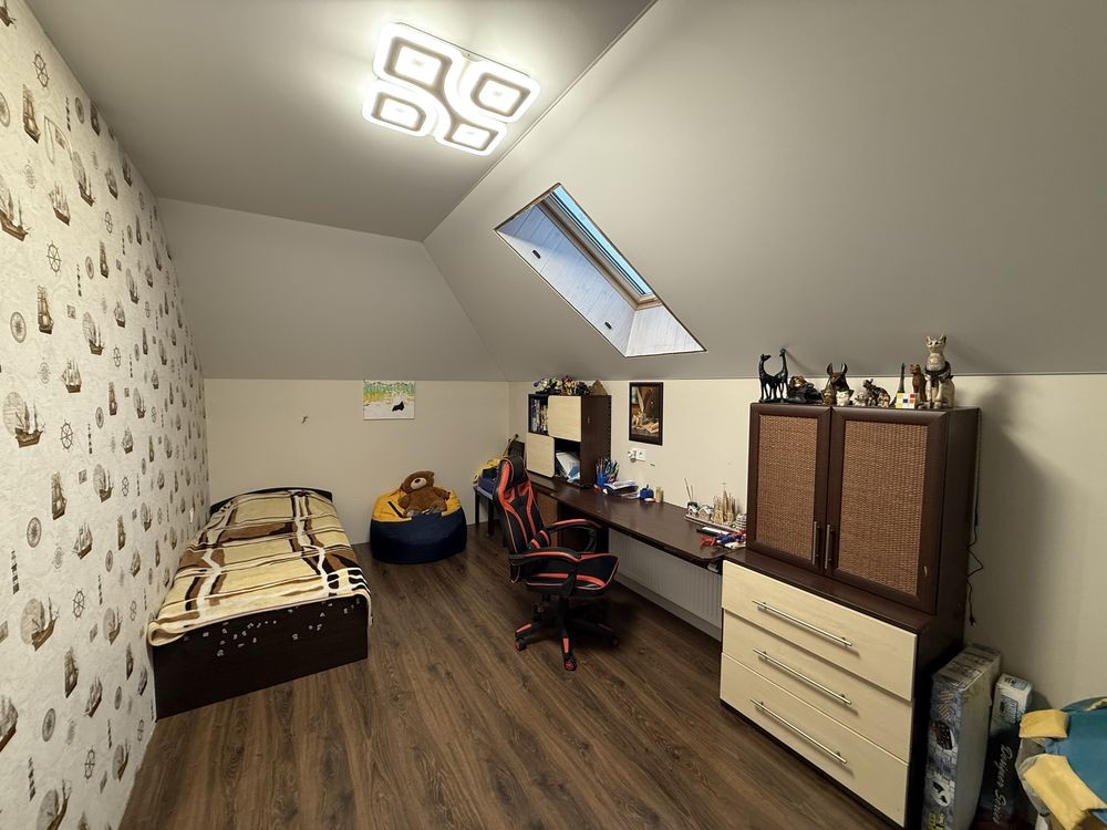 4 спальні, кухня-вітальня, 2 санвузли, кладова, горище (можна облаштувати під ігрову кімнату або комору).