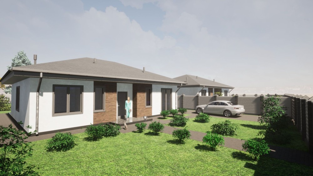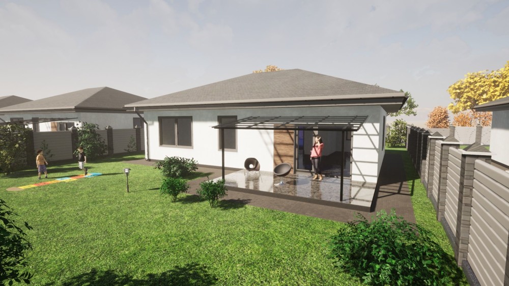 Фасадна штукатурка, будинок частково оздоблено плиткою, фасадна частина та зона тераси.