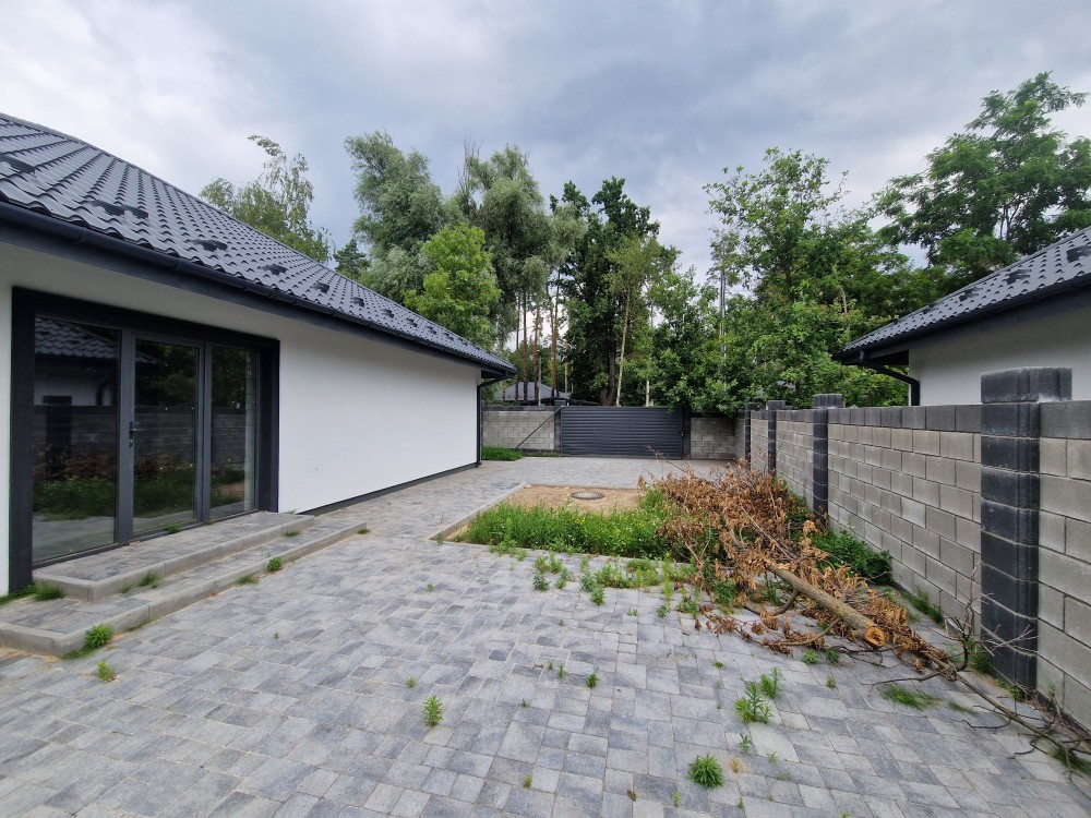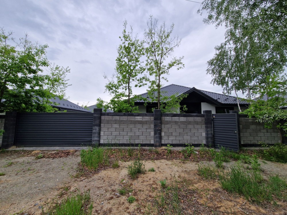 Є паркан з бетонних блоків, хвіртка, ворота, на ділянці бруківкою викладена стоянка на 2 машини, доріжки навколо будинку.
