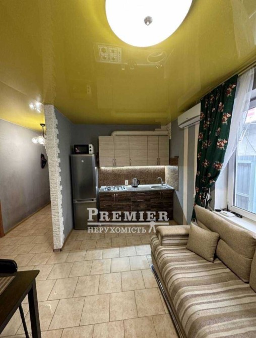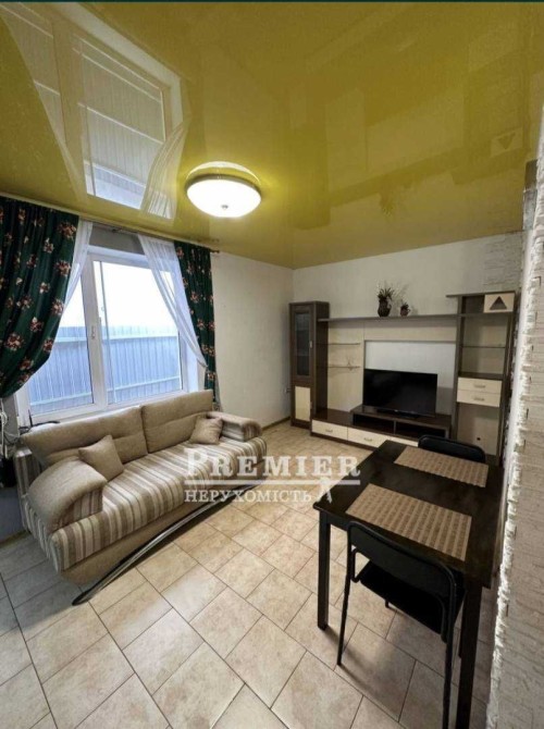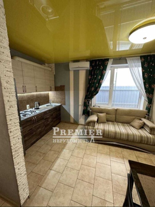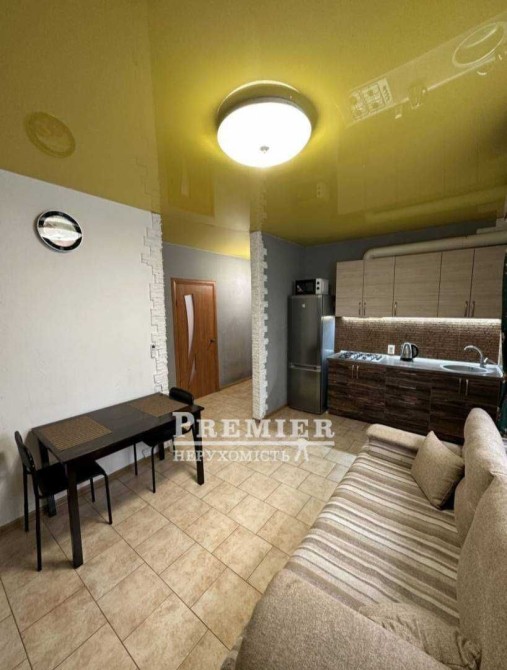 - Простора кухня-студія, обладнана смарт-телевізором, розкладним диваном, столом та стільцями.