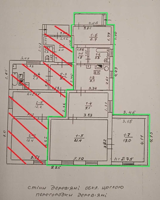 Частина будинку (63,5 м2) складається з трьох кімнат (43,5 м2), кухні (8,1 м2), санвузла, коридору та віранди.