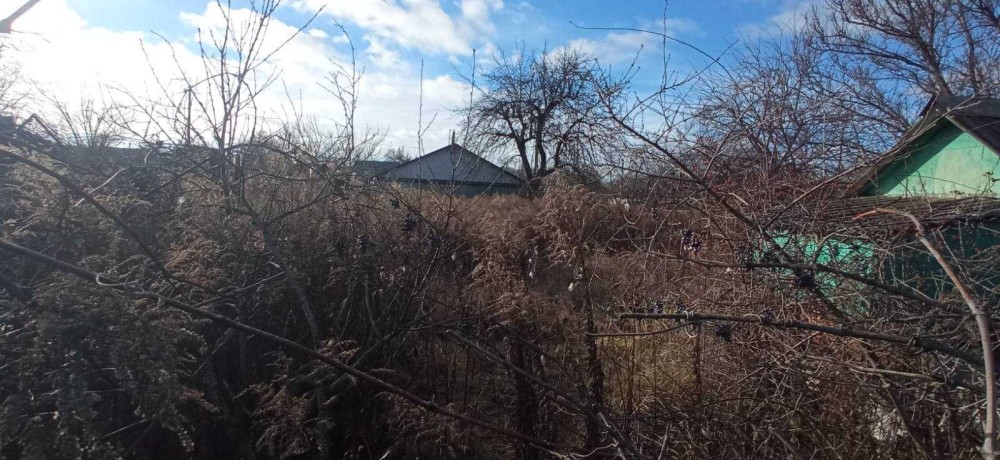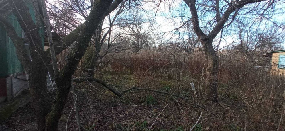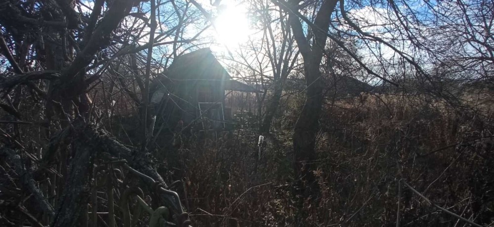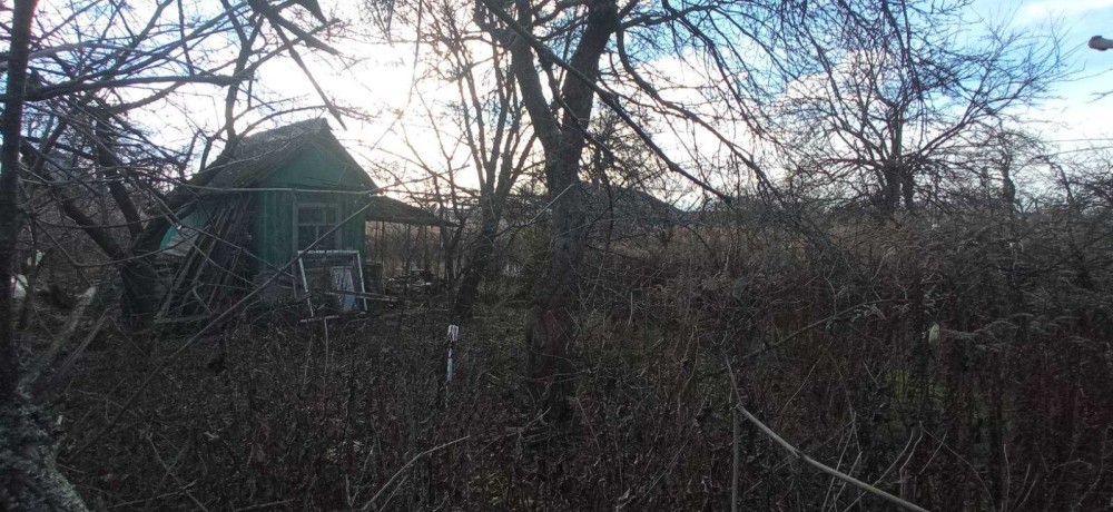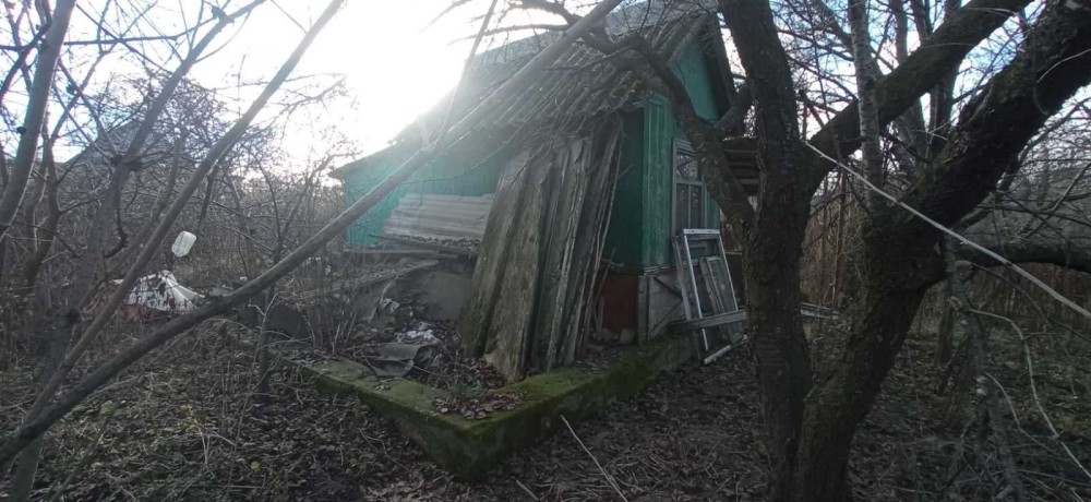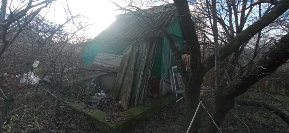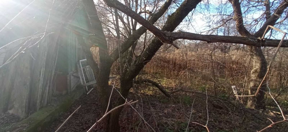 На ділянці є невеликий будинок, навіс, фруктові дерева.
