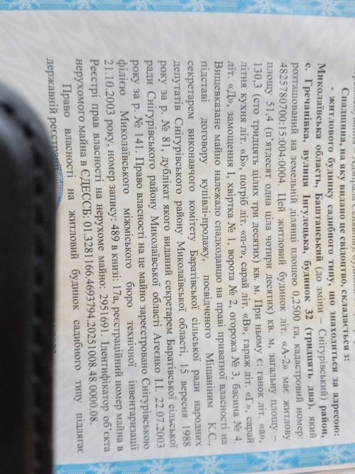 Продам півбудинку по вулиці Шевченка. Друга лінія від річки. Площа 52 метри. Три кімнати, коридор і кухня. Цегляний, накритий шифером. Підключені централізовані електроенергія і газ, вода заведена у будинок з колодязя, злив до вигрібної ями. Опалюється двома печами із заведеним газом. Встановлений бойлер. З коридору спуск у великий погріб. Сам будинок у хорошому стані, без усадок і тріщин, дах не тече. Усередині потрібний ремонт, але велика кімната в нормальній косметиці, підійде для тимчасового проживання. Ділянка 5 соток. З фасаду можна облаштувати місце під авто. На території сухий капітальний цегляний гараж з оглядовою ямою. Плюс можна збільшити ділянку на 1.8 сотки за рахунок вільної землі. Ціна: 29.000 у.о. Торг Агенція нерухомості "ІмперіЯ" надає повний перелік послуг з питань пов'язаних з нерухомістю: -безкоштовна консультація; -оцінка нерухомості; -послуги БТІ; -консультація з питань іпотеки; -оформлення спадщини; -кредит під заставу нерухомості; -купівля-продаж житлової нерухомості; -купівля-продаж комерційної нерухомості; -оренда житла; -оренда комерційних об'єктів; -купівля-продаж землі. Безкоштовно приймаємо заявки від продавців і орендодавців. Гарантуємо об'єктивну оцінку, якісну рекламну компанію і юридичну підтримку. Юридичний супровід угоди до моменту вручення право встановлюючих документів, перевірка нерухомості на наявність арештів, обтяжень, и.т.п. Надаємо послуги з супроводу у виготовленні документації: -на прибудову, перепланування, реконструкцію і тому подібне; -на приватизацію землі, присвоєння кадастрового номера; -на перевід під нежитлове, зміна цільового призначення; -на початок будівництва, введення в експлуатацію; -на узаконення самочинного будівництва; -терміновий викуп нерухомого майна. Офіційно зареєстроване підприємство з постійною адресою, кваліфікованою персоналом і досвідом роботи. Тел:(097)-800-17-32 (063)-647-15-24 (099)-760-74-79
