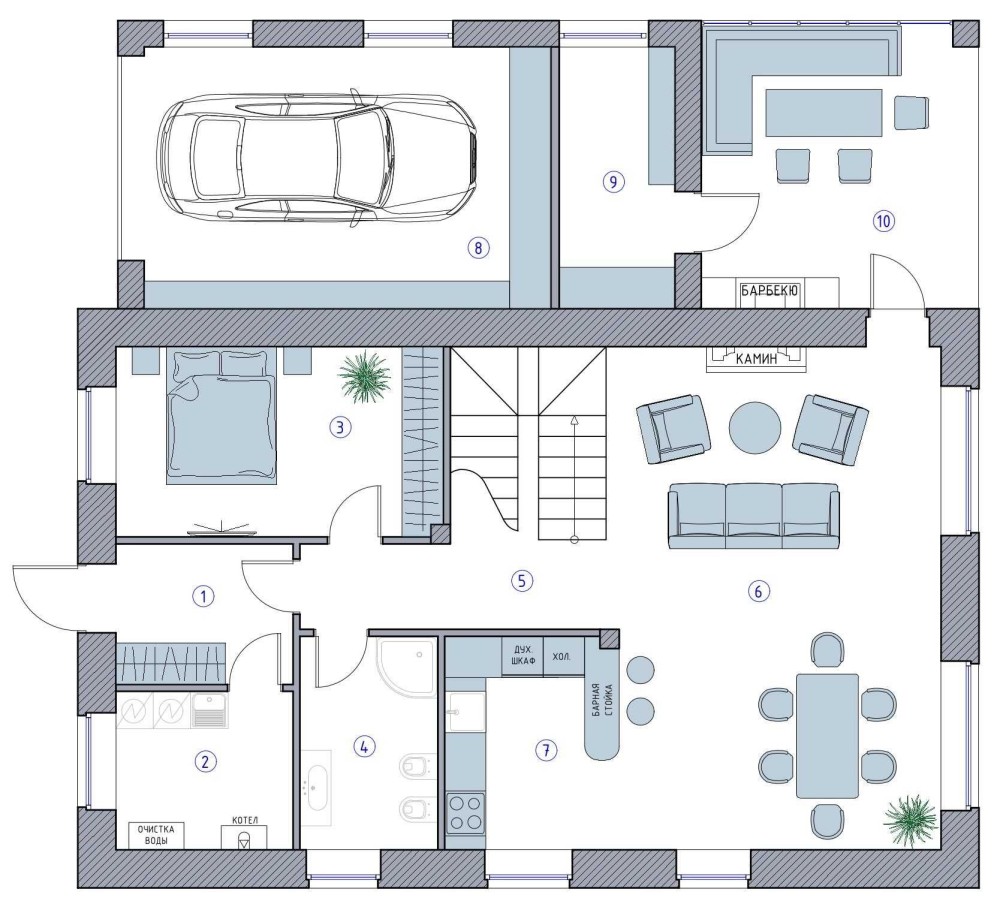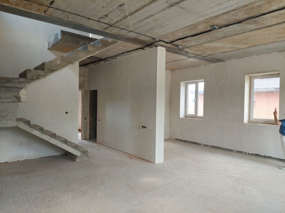 Планировка: 4 комнаты, кухня-гостиная, 3 санузла,гардеробная, техпомещение, котельная, гараж + парковочное место на участке, терраса с зоной барбекю.