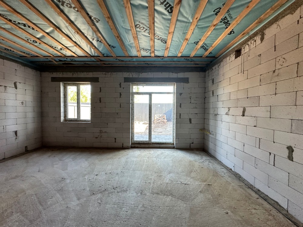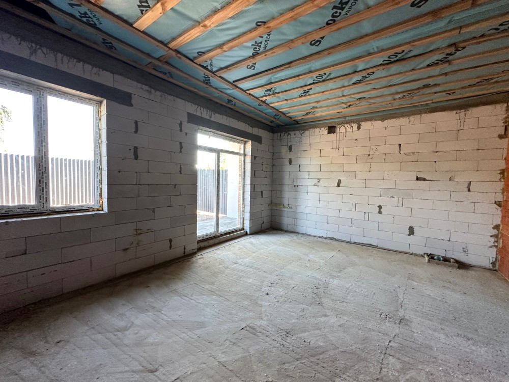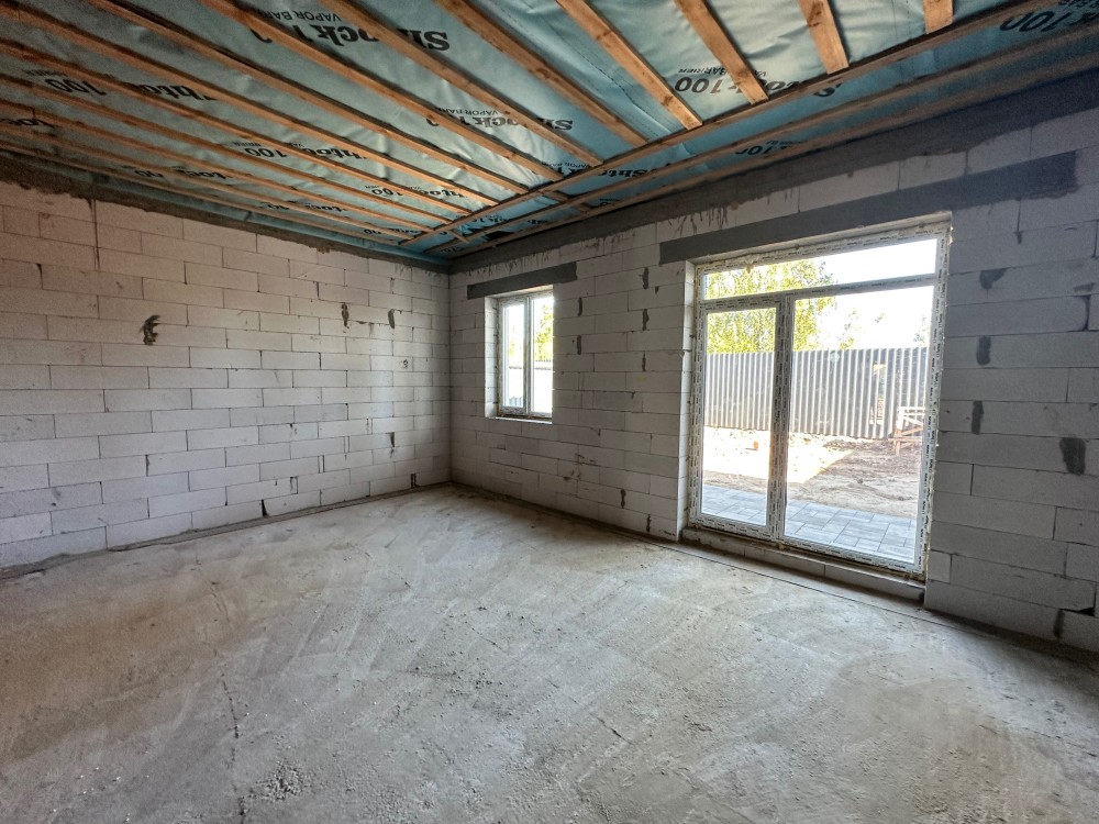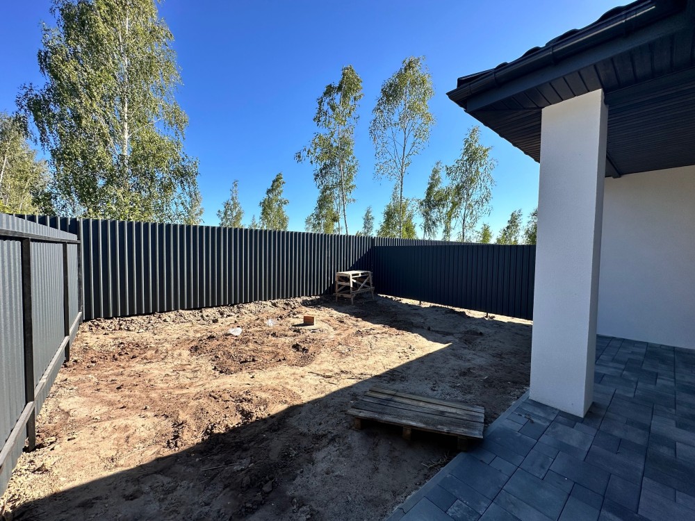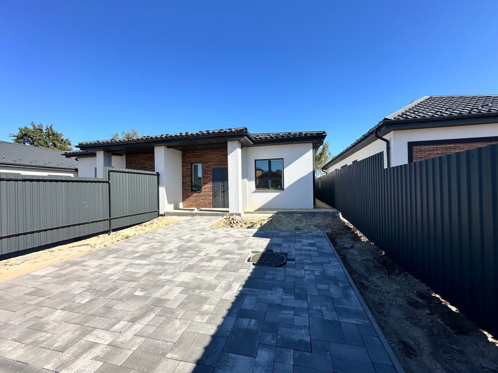 Планування зручне: велика кухня-студія, дві кімнати та два санвузли. Є місце для відпочинку у власному дворі — можна облаштувати терасу чи зону барбекю.
