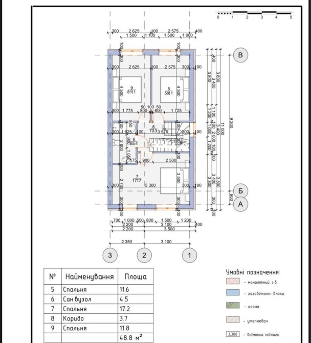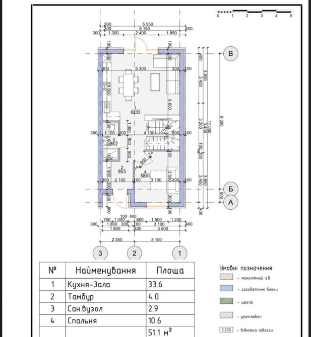 Площа 100 м² + мансарда. Перекриття обох поверхів бетонне. Стіни з газоблоку, утеплення базальтовою ватою.