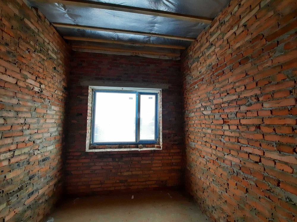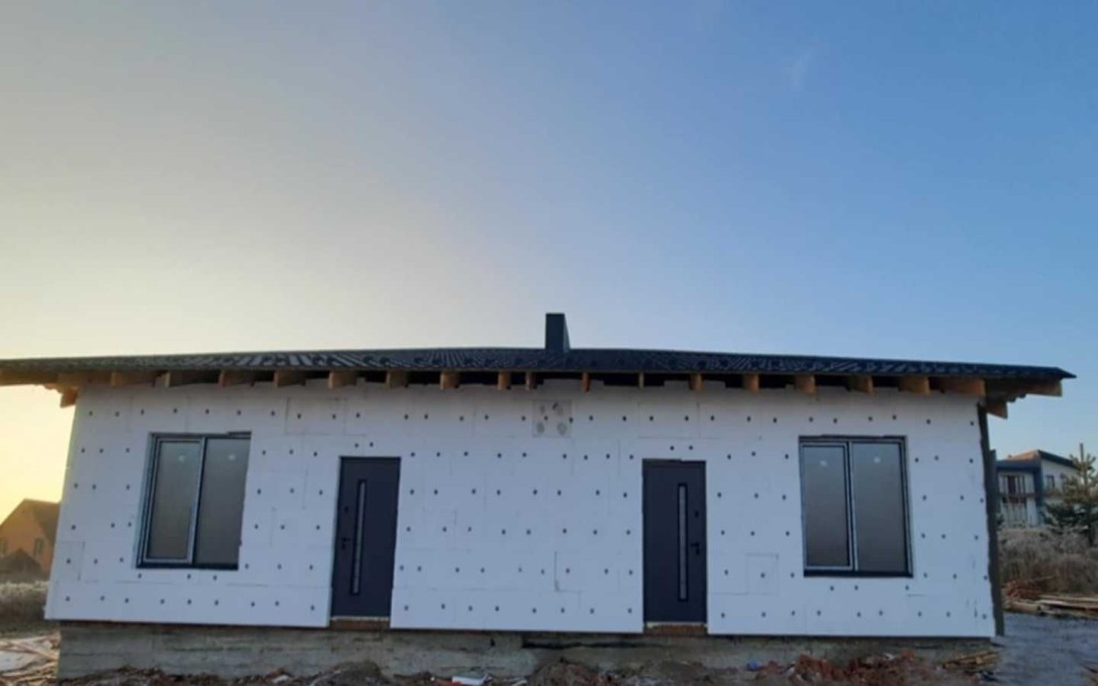 Котедж побудований з червоної цегли, утеплений фасад і дах.
