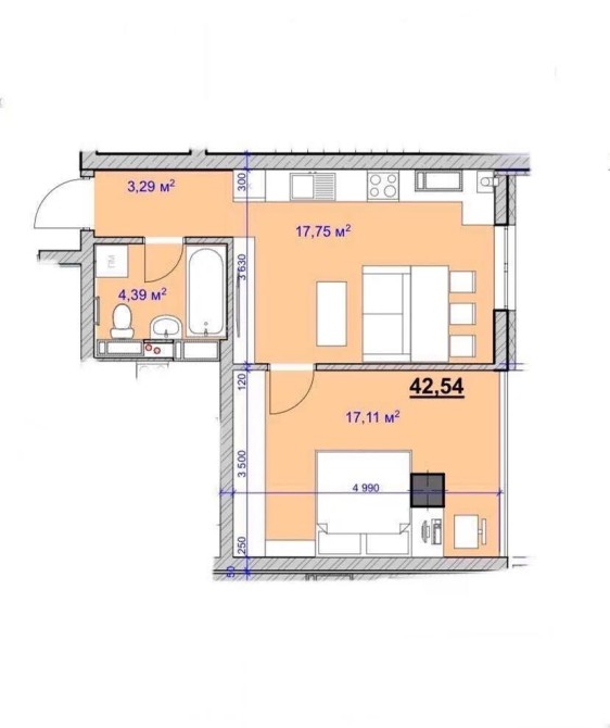 • Общая площадь 42.54 м2